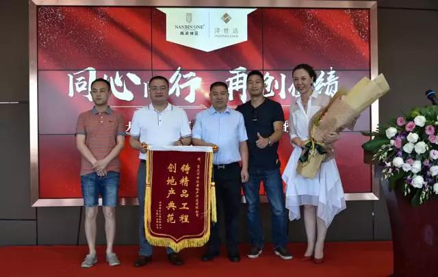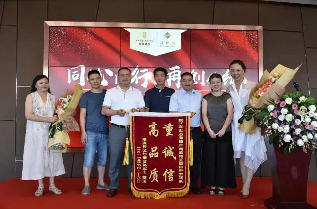 7月26日下午,南濱特區一區交付暨9號樓開盤總結表彰大會上,上演了一幕意外的插曲,南濱特區7號樓和3號樓的業主代表,為項目開發商重慶洋世達房地產開發有限公司送來了兩面錦旗,分別是“重誠信、高品質”和 “鑄精品工程、創地產典范”。