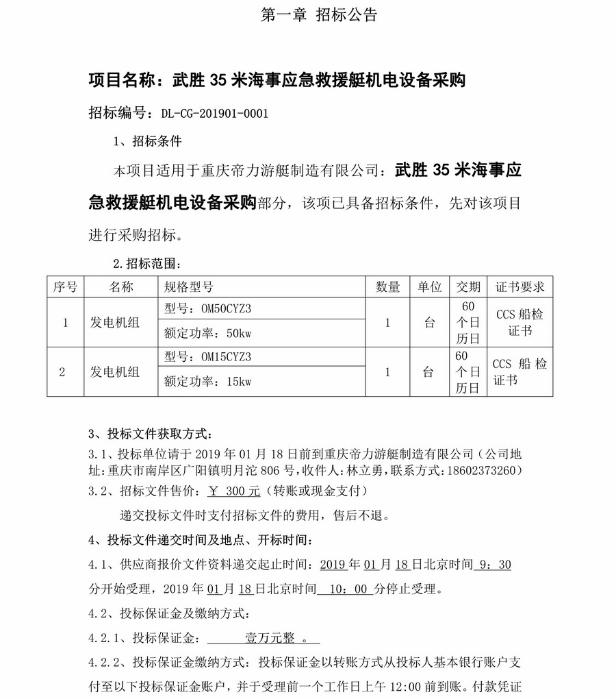 武勝35米海事應(yīng)急救援艇機電設(shè)備采購