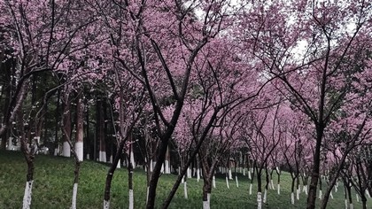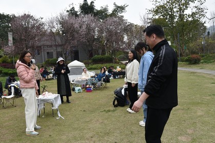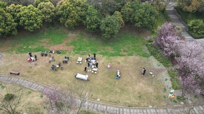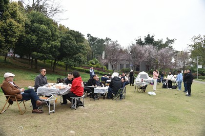 活動伊始,同事們各自攜帶露營裝備前往南山濕地公園。湛藍的天空,郁郁蔥蔥的樹木,盛放的櫻花林,綠油油的草地,空氣里到處彌漫著春日的氣息。