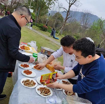 在大家的共同努力下,午餐準時端上了餐桌:稀飯、涼面、各式鹵菜、水果、飲料……大家一起盡享露營樂趣。當壽星們戴上了生日帽,現場唱起了生日祝福歌,會心的笑意洋溢在每位同事的臉上。