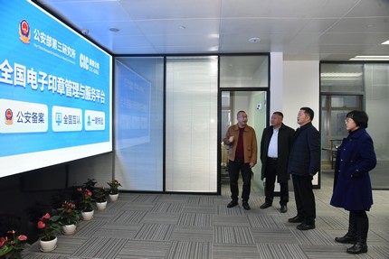 最后,調研組一行來到重慶國信公鏈印章有限公司走訪。作為公安部第三研究所及CIC國信公鏈研究院全國電子印章管理與服務平臺重慶市平臺,公司為重慶市內政務部門、企事業單位、社會組織及個人用戶提供電子印章權威備案、簽章、查詢、核驗等公共服務,搭建并實現了“公安備案、全國互認、一鍵核驗”的電子印章應用服務體系,為減輕企業運營成本、打破電子印章區域應用壁壘、助推數字經濟產業化發展做出了積極貢獻。